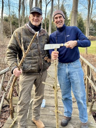 Armed with cedar branches from New Canaan Land Trust properties, John Hutchins and Chris Schipper this week gave the GreenLink bridge between Weed Street and the New Canaan Nature Center a much-needed touch-up. In just over three hours, they replaced 20 pieces of ornamental cedar, with Hutchins wielding a Japanese saw.