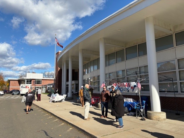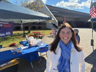 Kim Norton outside the polling place at New Canaan High School on Election Day, Nov. 4, 2025. Credit: Michael Dinan