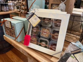 Pam Robinson: “This is our ‘Gift of Grilling,’ always a really good gift. This is our ‘9 Tin Gift Box.’ It includes some of our top grilling custom blends along with your everyday seasoning, such as parsley and our light chili pepper onions, and also some of our other really favorite products in the store. So if you have a griller in your family, that is a great gift.” Priced at $99.99. Photo credit: Michael Dinan