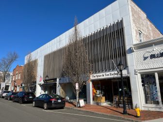 112 Main St. in New Canaan (with the vertical slats) on Dec. 2, 2024. It has a gross leasable area of 12,146 square feet. It sold for $5.1 million, according to a property transfer recorded Dec. 31, 2025 in the Town Clerk’s office. Credit: Michael Dinan