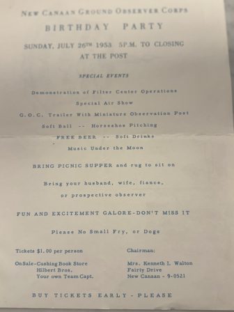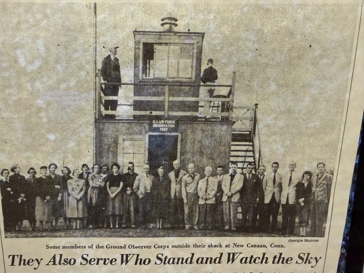 As reported by the Advertiser on April 17, 1958: “New Canaan Skywatch was reactivated for a surprise eight-hour exercise in aircraft spotting Wednesday at the Ground Observation Corps post on Lone Tree Hill, called by the U.S. Air Force on short notice. The communication alerting the local post asked that spotters report only aircraft considered to be a potential threat. These, the letter listed as “multi-jets, bi-jets, multi engine craft (more than two) and single jets flying in formation of three or more, plus all ‘unknown’ aircraft.”