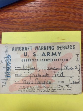 Mrs. Mary Lambert Welling, a local girl born in 1897, served as the Supervisor of the observation post during World War II, and she ran a tight ship. According to her May 19, 1979 obituary in the New Canaan Advertiser, the town’s GOC corps was “one of the few in the nation to maintain a 24 hours a day look-out for more than three years” during World War II. On three occasions the corps was cited for its reporting of planes in distress and received several commendations for alert handling of both routine and emergency conditions. For her work for the local corps, which included ‘arranging for construction of a look-out tower and base headquarters,’ Mrs. Welling received citations from the U.S. Air Force, state Civil Defense leaders, and the Hannah Benedict Chapter of the Daughters of the American Revolution.”