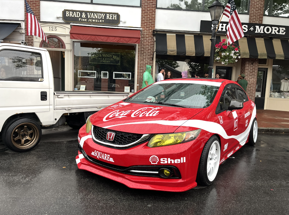 Through a drizzle on an otherwise comfortable day, visitors to the car show launched by New Canaan’s Doug Zumbach—owner of the eponymous coffee shop at Pine and Grove Streets—stopped to admire specialty and classic autos, take photos and videos, and chat with owners and vendors on Elm and Pine Streets, closed for pedestrians.